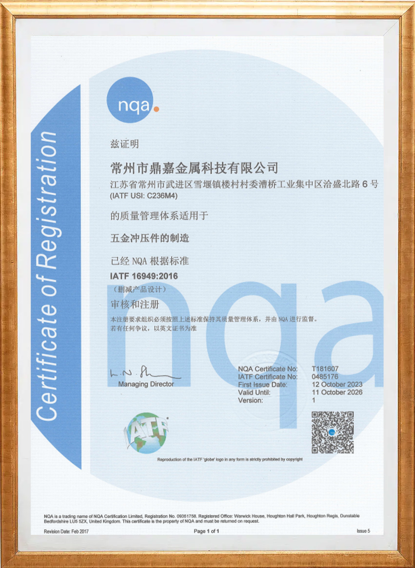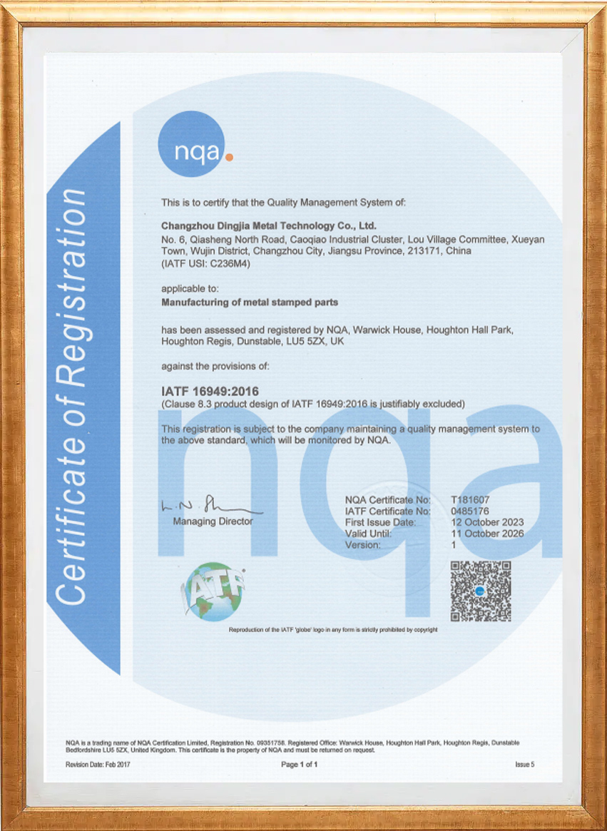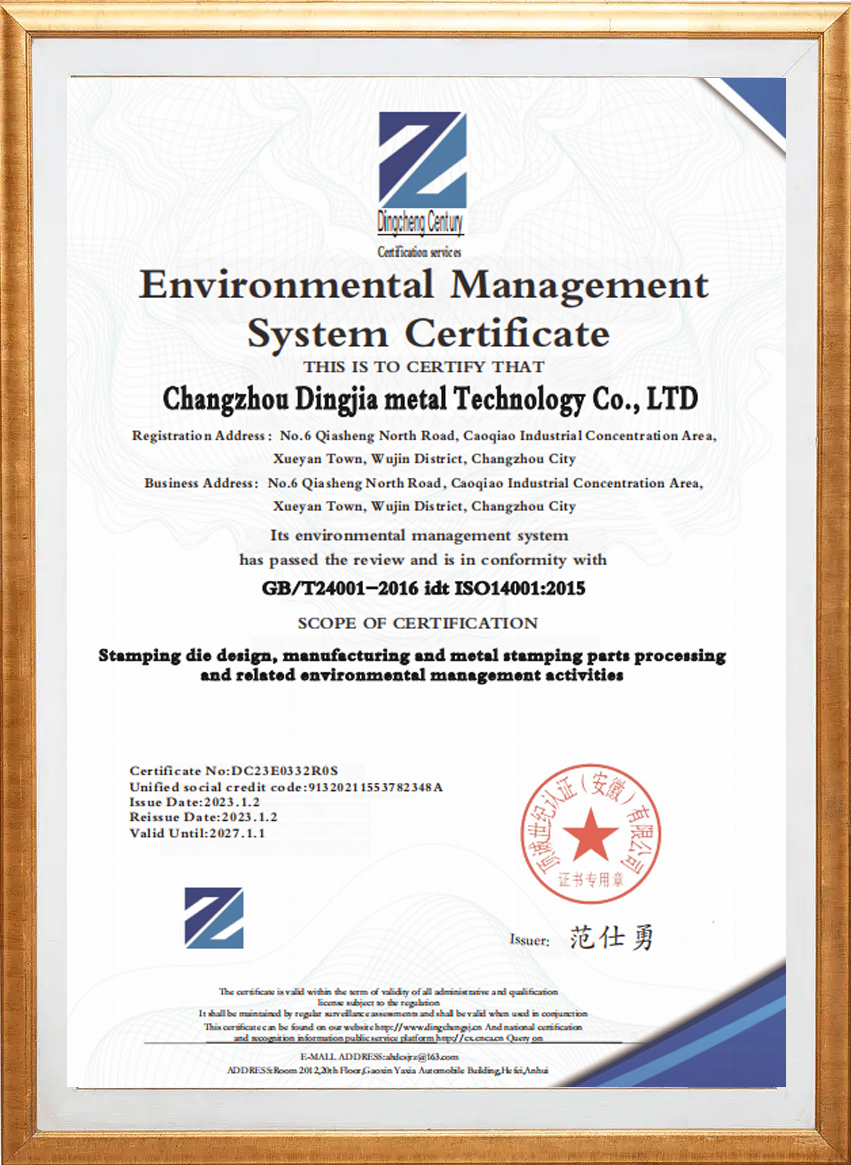 Changzhou Dingjia Metal Technology Co., Ltd. blev oprettet i 2010. Dens vigtigste forretning er design, samling og vedligeholdelse af præcisionsmetalforme samt fremstilling af metalstemplingsdele. Det er en privatejet virksomhed, der hovedsageligt beskæftiger sig med produktion af præcisionsmetalstemplingsdele. Virksomheden ligger i Xueyan Town, Wujin District, Changzhou City, støder op til Taihu Lake Lake, 220 km fra Shanghai Pudong lufthavn og 59 km fra Changzhou Benniu International Airport. Planteen dækker et område på 5400m². I 2024 tilføjes yderligere 1500 m² plante med en registreret kapital på 19 millioner yuan. Virksomheden har et komplet kvalitetsstyringssystem og har fået branchegenkendelse for sin integritet, styrke og produktkvalitet. Produktionsprodukterne distribueres hovedsageligt inden for biler, elektronik og medicinske maskiner og er blevet partnere med mange velkendte virksomheder.